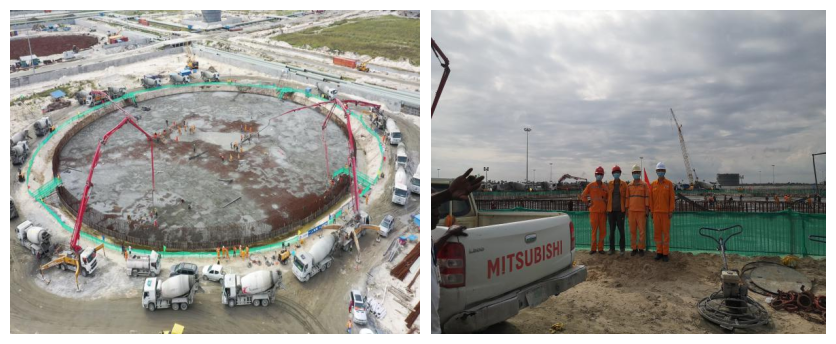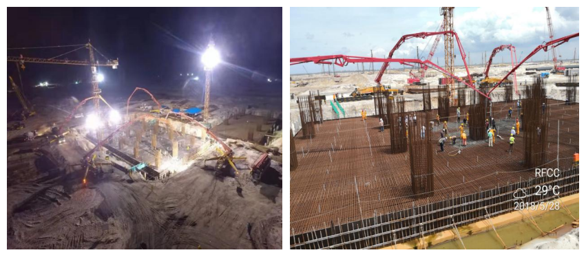 2020年9月28日,顺利完成了TF-62原油罐单体混凝土一次性浇注任务,该原油罐直径96米,混凝土7000立方米。任务执行期间正值新冠疫情高发期,国内公司领导高度重视,现场项目部和各岗位班组密切协调配合,中外员工近200人协同作战,先后动用搅拌站8座,泵车5台,搅拌车41辆。当时正值当地雨季,大雨瓢泼,现场及道路损坏严重,施工过程中项目部克服一边修路一边生产、水泥供应短缺,设备故障等困难,通过全体人员的共同努力,共历时46小时,顺利圆满地完成了此次浇注任务。