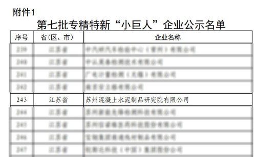 近日,江苏省工业和信息化厅公布了第七批国家级专精特新“小巨人”企业名单,公司凭借在混凝土与水泥制品领域的技术创新实力、市场领先地位及卓越产品质量,成功入选!